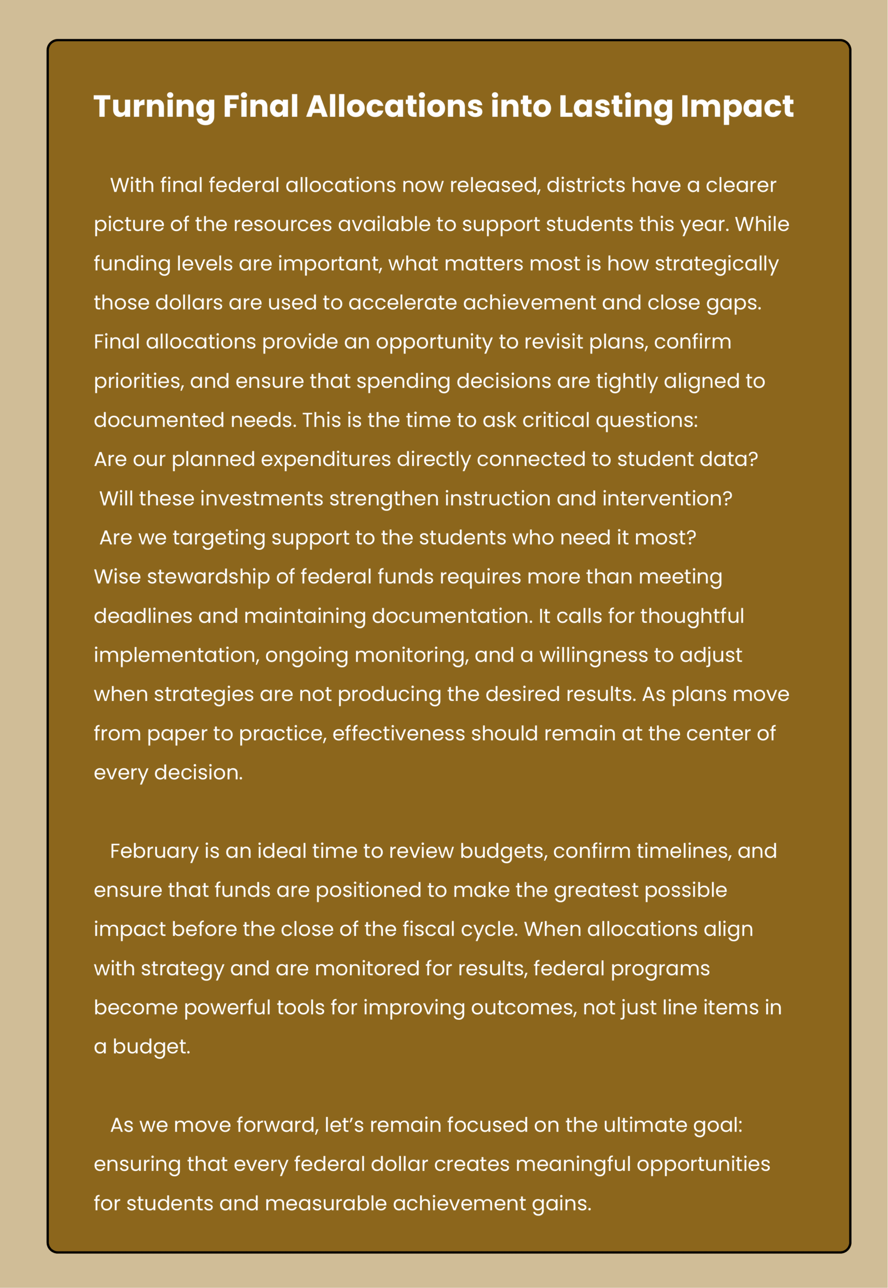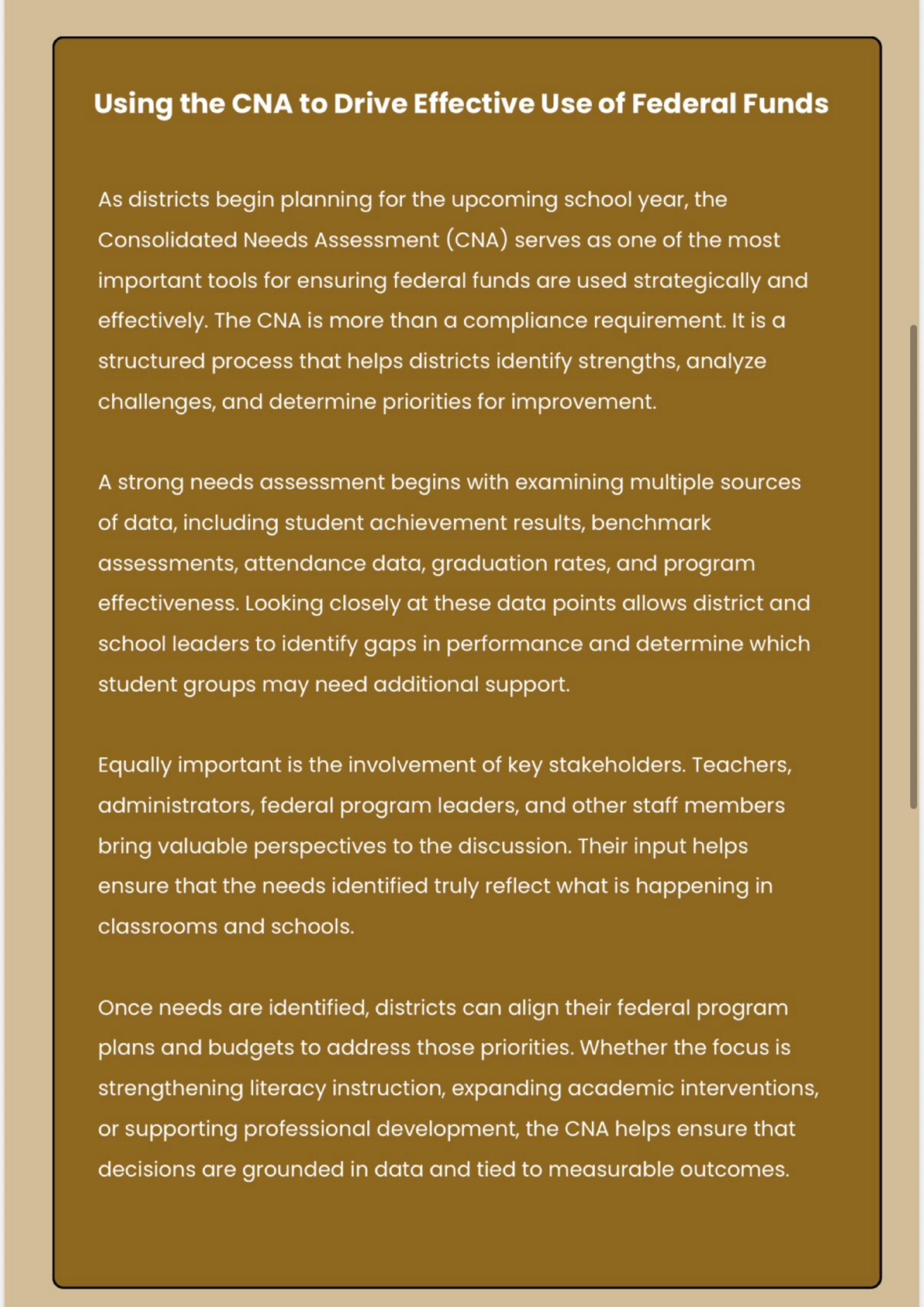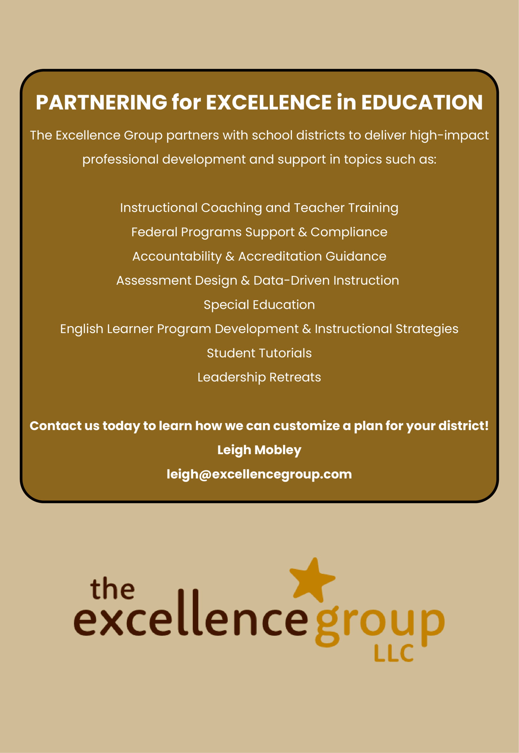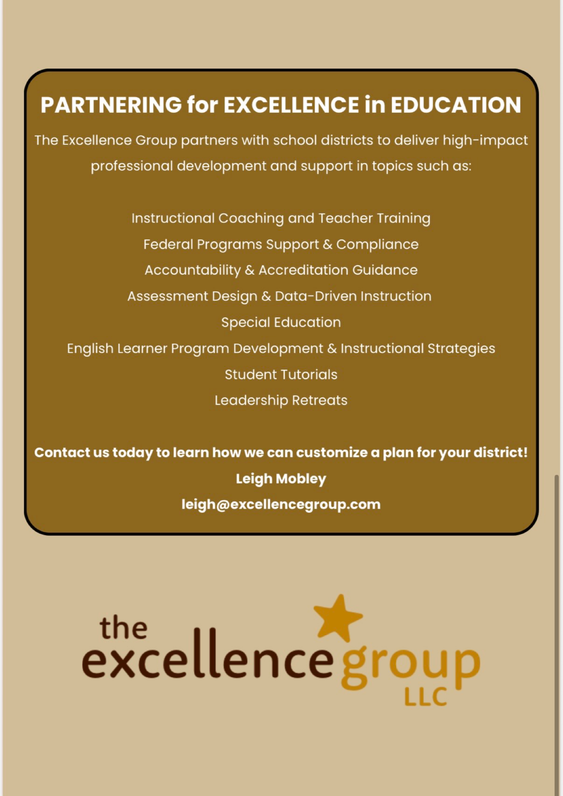 The Excellence Group, LLC consultants are professionals with proven performance. Consultants build relationships with the schools they serve and will develop customized services for your district.